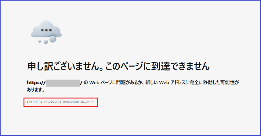 では最後のケースになりますが、これは最近増えてきたエラーになりますが、下図のように「https:~のWeb ページに問題があるか、新しい Web アドレスに完全に移動した可能性があります。」と表示され、エラーメッセージとして「ERR_HTTP2_INADEQUATE_TRANSPORT_SECURITY」と表示されてしまうケースになります。