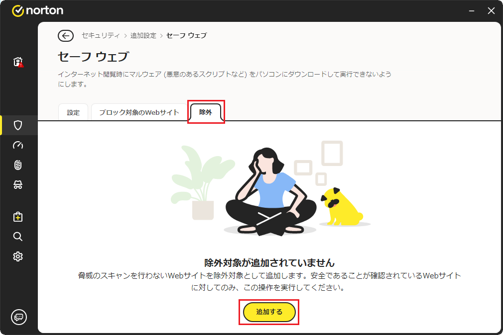 すると下図のような画面が表示されますので、「除外」というタブをクリックした後、続いて「追加」というボタンをクリックします。